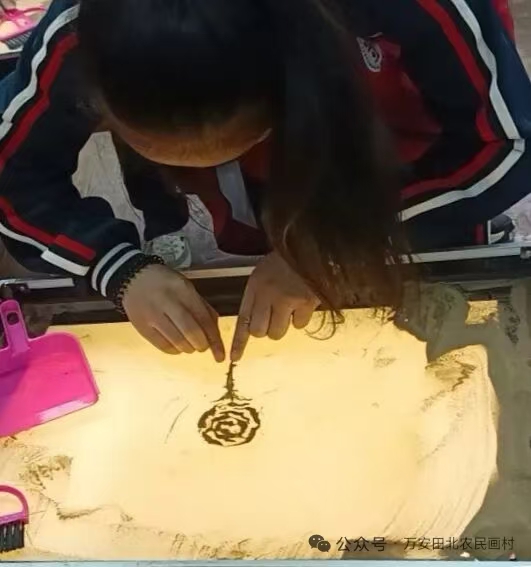 在光与沙的交织中,同学们迎来了研学的第一站——沙画体验。小小的沙粒,在指尖灵活地跳跃、铺撒,从无到有,勾勒出心中最美的图画。看他们那认真专注的小眼神,未来的“沙画大师”说不定就在这里诞生呢!